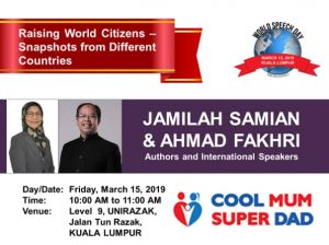 Title: Raising World Citizens: Snapshots From Different Countries Open to the public. Friday 15th March 2019. 10am - 11am. Level 9, UNIRAZAK, Jalan Tun Razak, Kuala Lumpur. Session is in conjunction with World Speech Day.