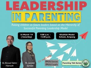 KMS PARENTING TALK SERIES LEADERSHIP IN PARENTING 16 March 2019 (Saturday) 9am – 12pm Khalifah Model School (Primary), Ampang -------------------------------- LIMITED TO 20 SEATS ONLY! -------------------------------- Join us as we invite Br. Ahmad Fakhri Hamzah and Pn. Jamilah Samian to speak to us about Leadership In Parenting. Leadership In Parenting presents […]