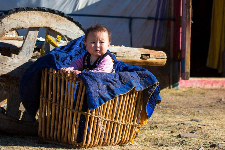 In nomadic families, children are introduced to nature almost from birth. The ger (yurt), their traditional home, is built to move with the seasons. The ger is compact, practical, and open to the elements. Babies nap to the gentle rhythm of horses galloping nearby, or the crackle of a dung fire keeping the family warm. Even before they can walk, babies are carried on horseback with their mothers, wrapped snugly against the cold.
